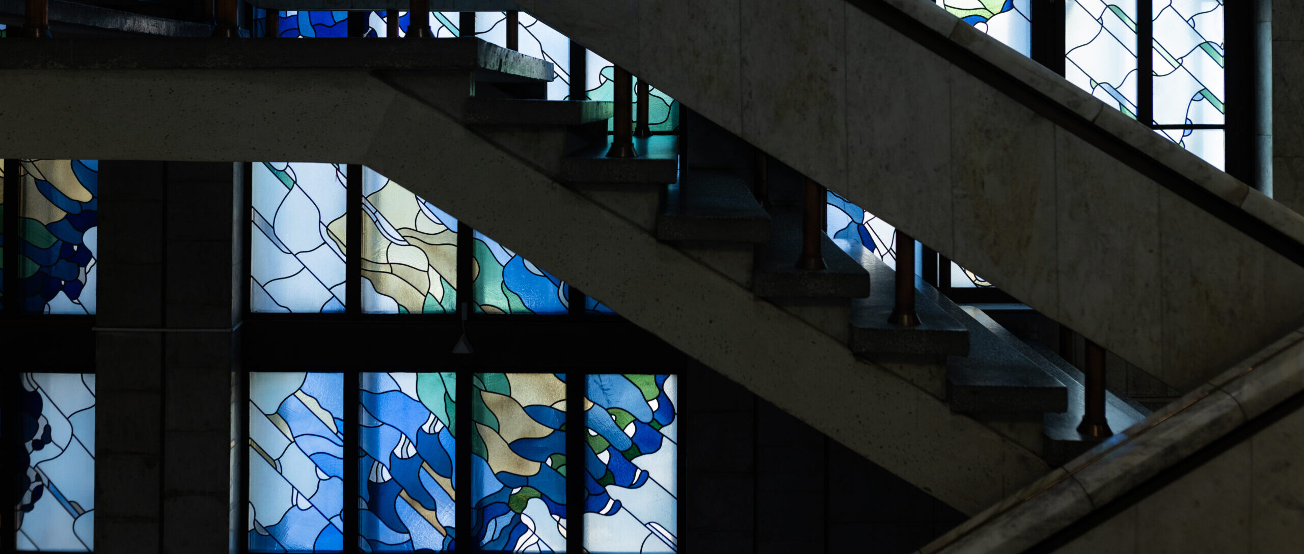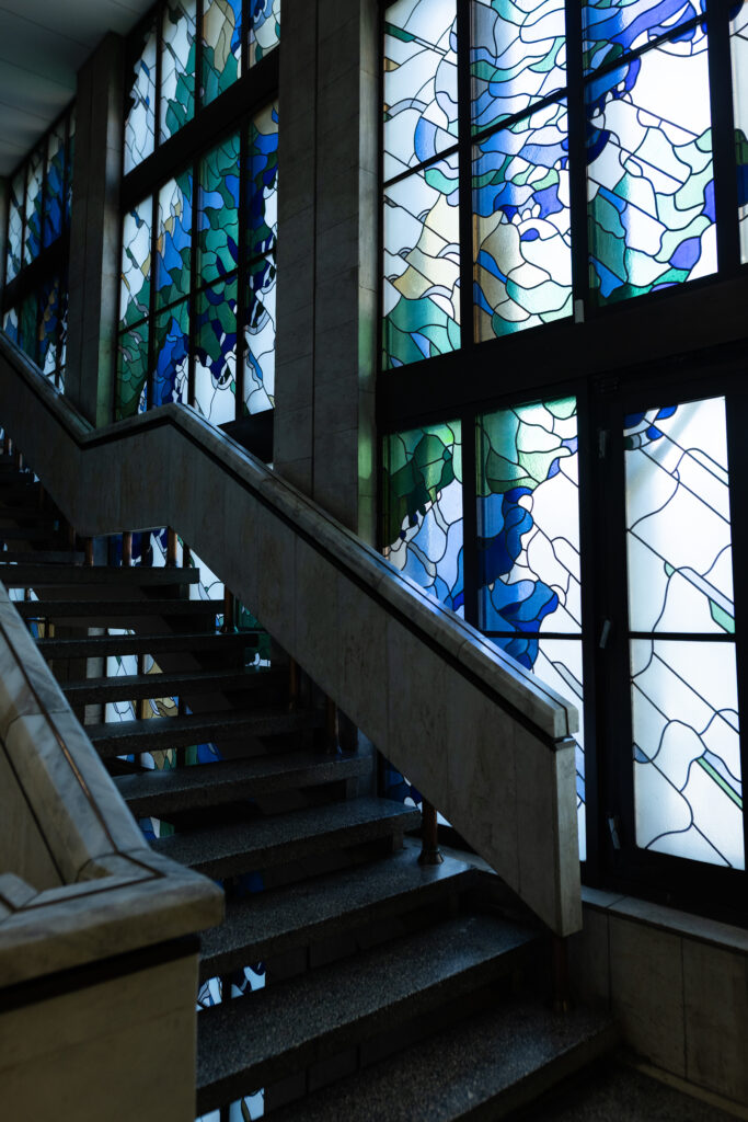 Vitražų menas sovietmečiu buvo glaudžiai siejamas su prestižiniais objektais, tad jų gausa šiuose rūmuose pabrėžė institucijos svarbą. „Kai tik įeini į vidų, iš karto pasitinka šviesa, sklindanti per vitražus. O didysis, trijų aukštų vitražas vakarinėje pastato pusėje – ypatingas.