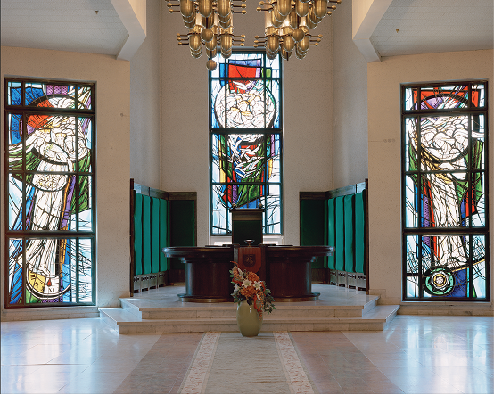 Vis dėlto tikrasis pastato perlas slypi viduje – tai Algirdo Dovydėno kurti vitražai.