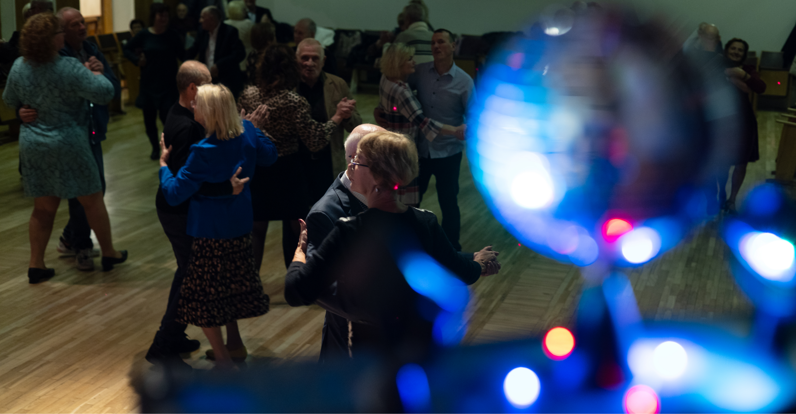 Laiptais pakilus į antrą aukštą, patenkame į salę po gražiuoju sietynu. Mums jau patinka, jau gražu – čia stovi įmantriai papuošta Kalėdų eglė, palei sienas išrikiuoti antikvariniai baldai, stalai užkloti staltiesėmis, ant jų – kavos termosai ir užkandžiai. Atrodo, pasispaudus ir šokiams vietos pakaks. Bet pro toliau esančių durų plyšį pamatome Janiną – pasipuošusi žaižaruojančiu tamsiu kostiumu, ji stovi scenoje, už pulto. Krapštosi prie laidų, žiūri į kompiuterio ekraną, tikrina mikrofono garsą. Įėjus vidun, patenkame į autentišką šokių salę, kuri, laimei, nepatyrė euroremonto. Išskirtinė lubų ir sienų apdaila, į sceną veda elegantiški laiptai, o šokėjų jau laukia spindintis medinis parketas. Tiesa, parketą per vienus šokius gerokai apgadino sprogęs radiatorius ir iš jo pasipylęs vandens fontanas, bet tai sužinosime vėliau. Janina jau įjungusi šventinį apšvietimą – didelės lempos po salę varinėja įvairių spalvų ornamentus. Tą sekundę mums jau aišku, kad čia bus tikri šokiai.